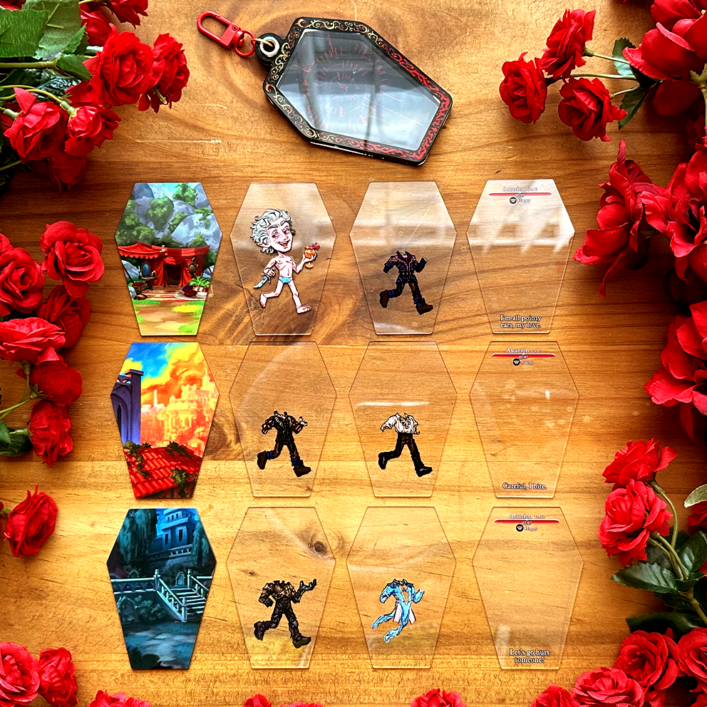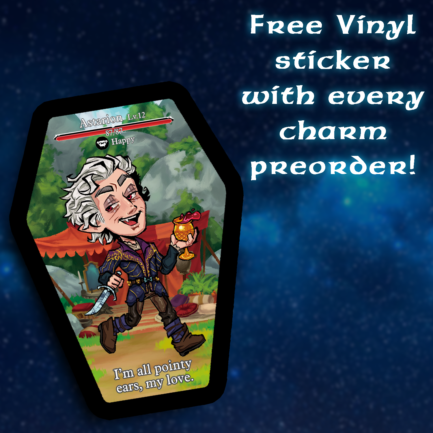 This Outfit Changing Acrylic Charm is perfect for any Astarion fan. This charm measures 4 inches tall, and swings open on a hinge around the keychain hole, allowing you to place panels inside the charm and dress up Astarion!