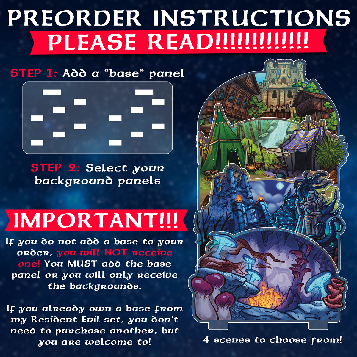 PLEASE NOTE: These panels are NOT sold with a base. You MUST add the "Base" option into your order or YOU WILL NOT RECEIVE ONE. Add as many bases as you like, or, if you already have one from my Resident Evil set (these are the same bases), you don't need to add one. To get multiple backgrounds, you must add them to your order one at a time.